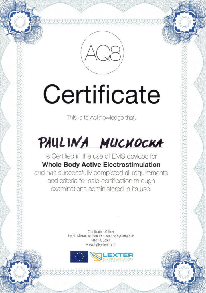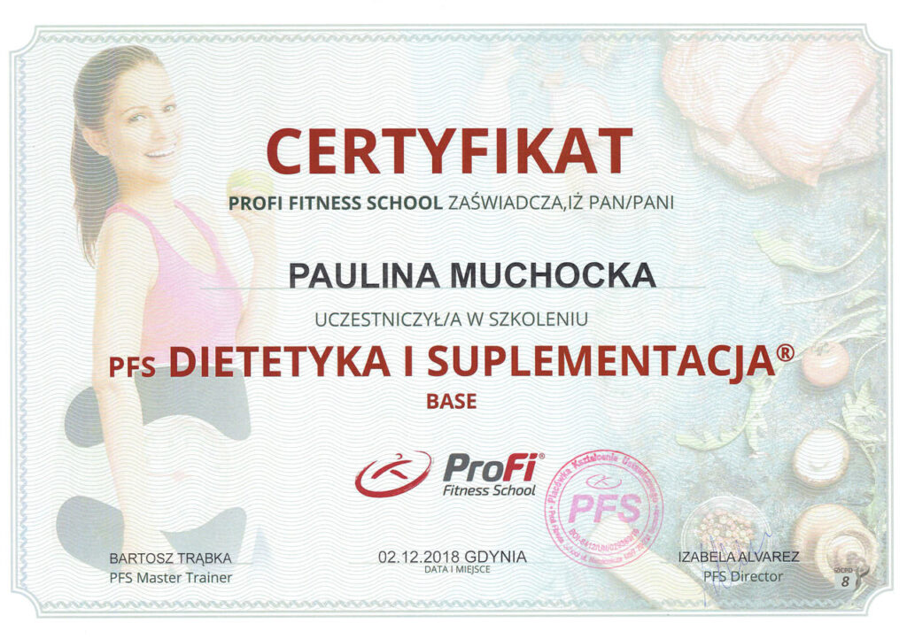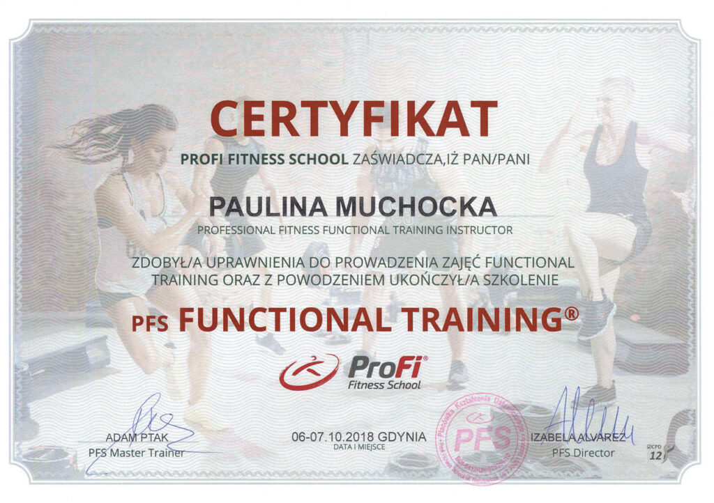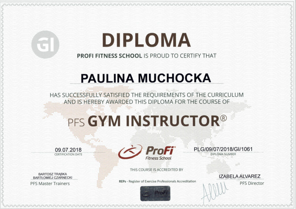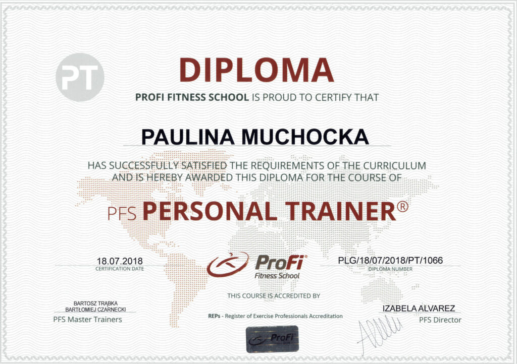 Przygotowując się do zawodu trenera personalnego, ukończyłam prestiżowy kurs trenera personalnego oraz instruktora siłowni w szkole Profii Fitness School, kurs trenera EMS, a także szereg dodatkowych szkoleń i warsztatów, takich jak: