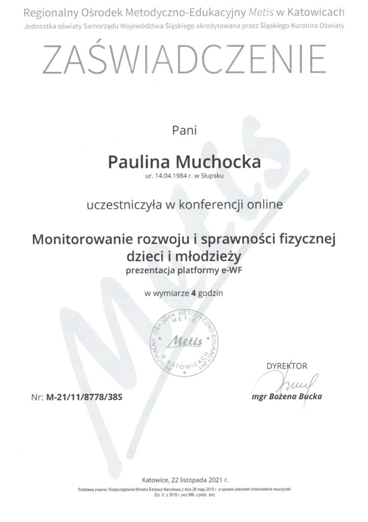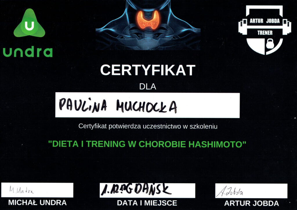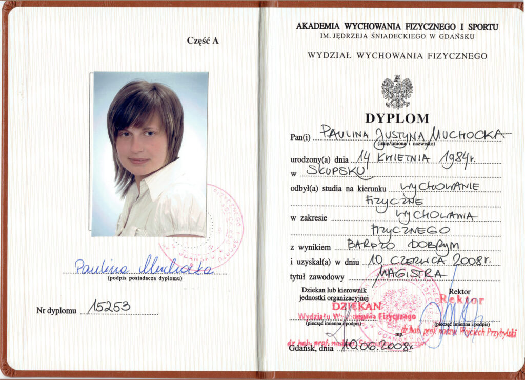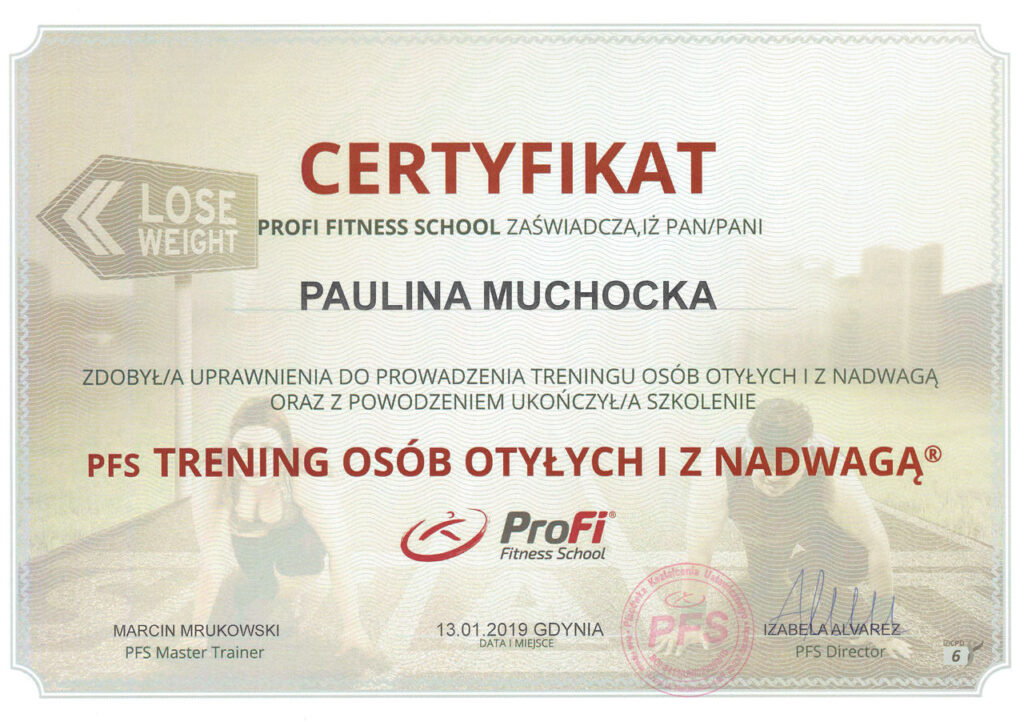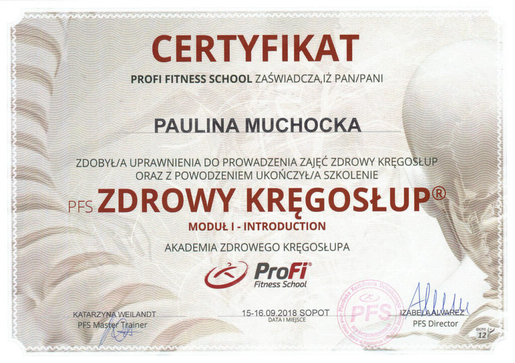 Przygotowując się do zawodu trenera personalnego, ukończyłam prestiżowy kurs trenera personalnego oraz instruktora siłowni w szkole Profii Fitness School, kurs trenera EMS, a także szereg dodatkowych szkoleń i warsztatów, takich jak: